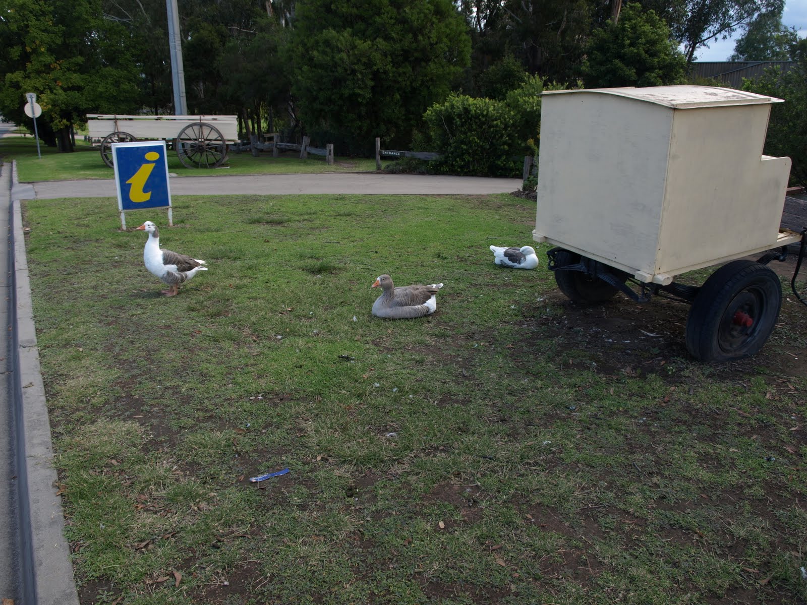 Orbost Information Centre is housed in this old slab hut. Below are the town's resident geese which are housed at the information centre. The bottom photograph shows the old pump house at the butter factory by the Snowy River on which flood markers have been added over the decades.